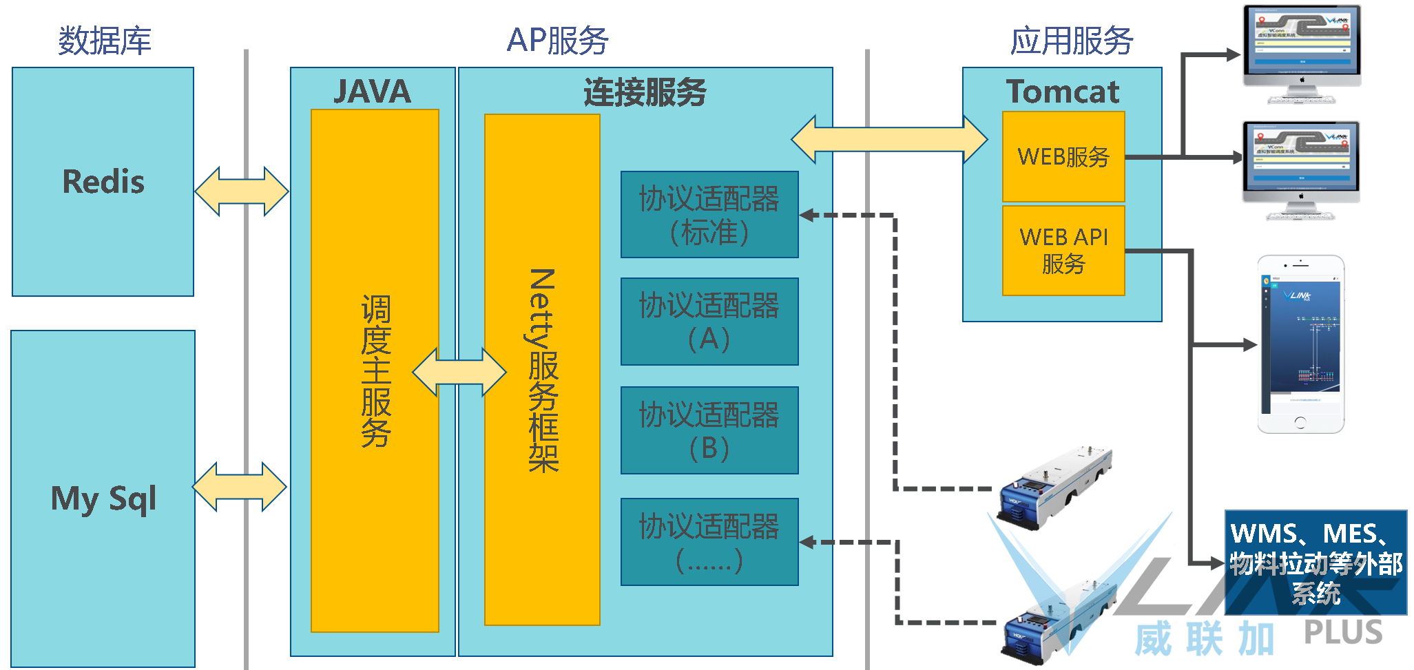 VConn智能物流中台从解决客户痛点、AGV行业难点以及物流行业集成场景分散、复杂度高等挑战出发,已成功在3C、光伏、锂电、军工航天、半导体、注塑、汽配等多个行业的数百家大型客户中实现长期应用落地。VConn统一调度各种导航方式,各种类型的AGV,赋能客户根据自身场景选择不同的AGV车型,充分发挥其特性,解决AGV行业长期存在的物流孤岛痛点。同时,系统采用独创的热插拔技术,能够快速配置AGV运行过程中需要对接的设备,如电梯、滚筒线、提升机、机械臂等,从而与工厂的无人搬运计划紧密配合,实现智能物流的价值逐步推进。系统还根据制造业物流特点,集成了大量特有场景的物流设备,如堆垛机、天车、分播墙,使所有物流设备能够灵活、模块化地集成和应用。